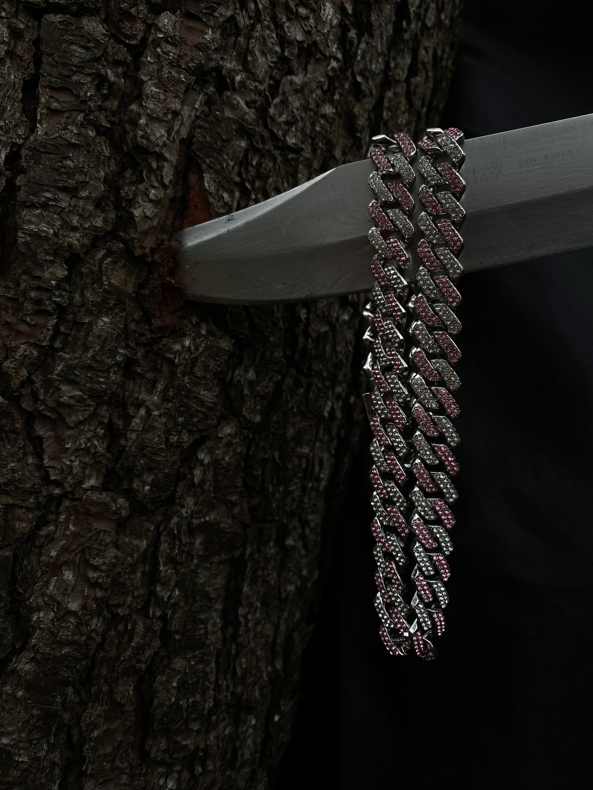 Un diseño que combina estilo y resistencia. Esta cubana de 50 cm está elaborada en acero inoxidable quirúrgico, lo que garantiza durabilidad y brillo que se mantiene con el tiempo. Sus eslabones en tono rosado le dan un toque moderno y diferente, mientras que las circonias tipo diamante añaden un destello elegante y llamativo.