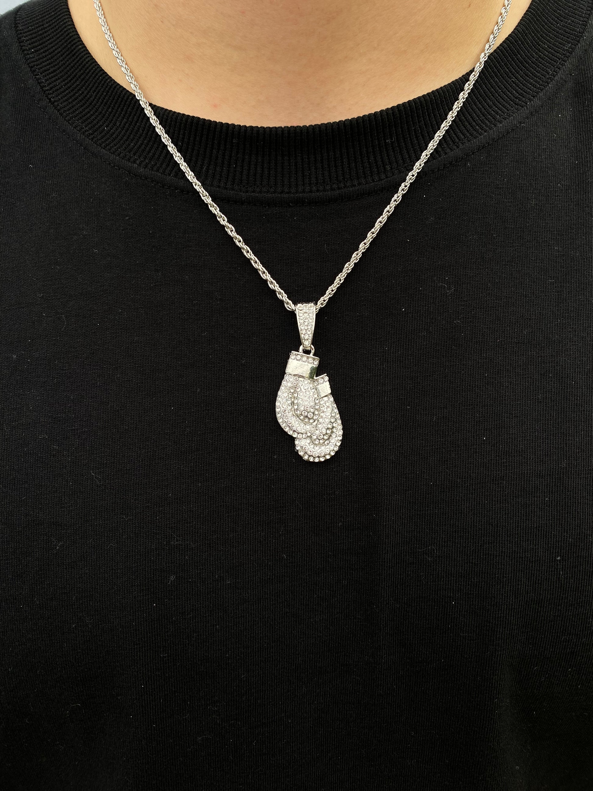 Este dije con cadenita representa la fuerza y la pasión del boxeo, diseñado con circornas de diamante brillantes que resaltan cada detalle. Disponible en plateado y dorado, hecho en acero inoxidable quirúrgico, resistente y elegante. Perfecto para darle un toque único a tu estilo diario.