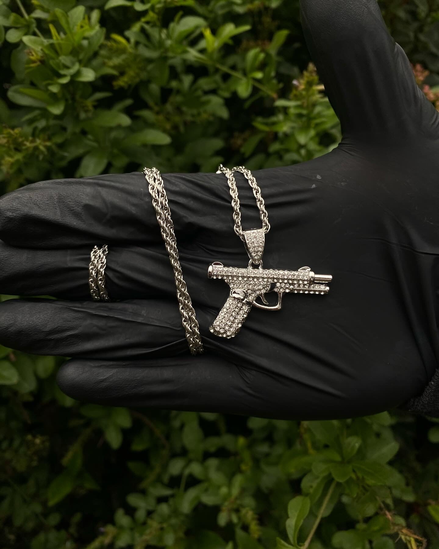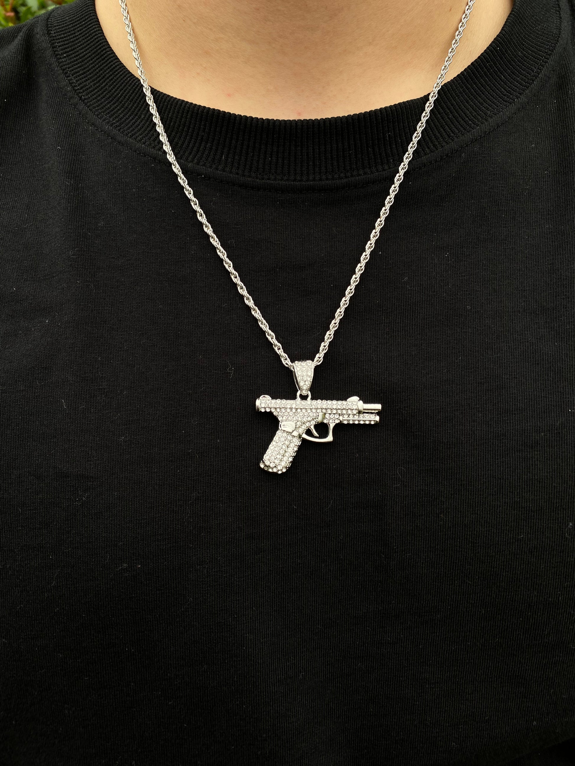 Dije con cadenita de pistolita 9 mm, decorado con circornas de diamante brillantes, disponible en plateado y dorado. Fabricado en acero inoxidable quirúrgico, ideal para lucir un estilo atrevido y sofisticado al mismo tiempo.
