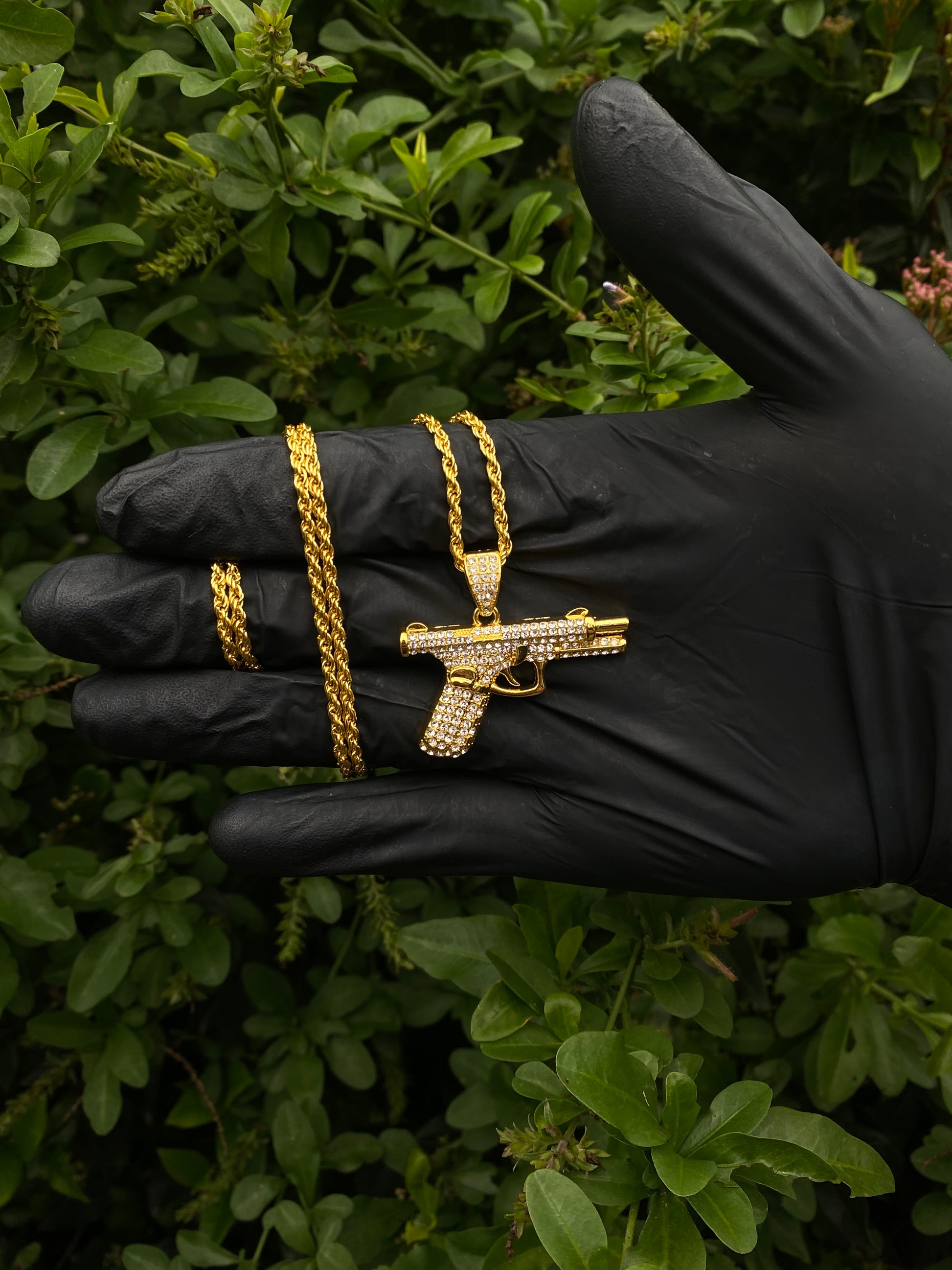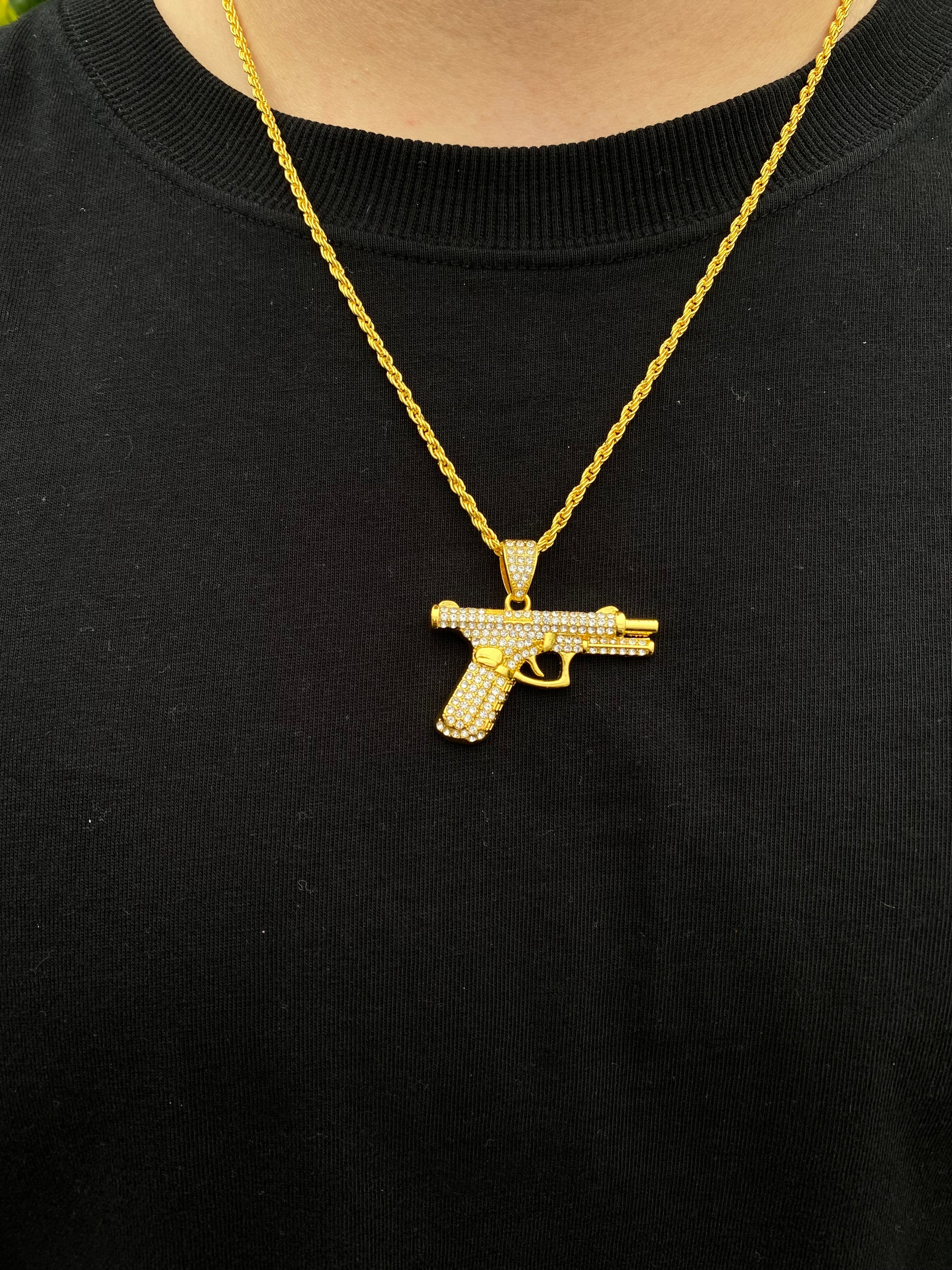 Dije con cadenita de pistolita 9 mm, decorado con circornas de diamante brillantes, disponible en plateado y dorado. Fabricado en acero inoxidable quirúrgico, ideal para lucir un estilo atrevido y sofisticado al mismo tiempo.