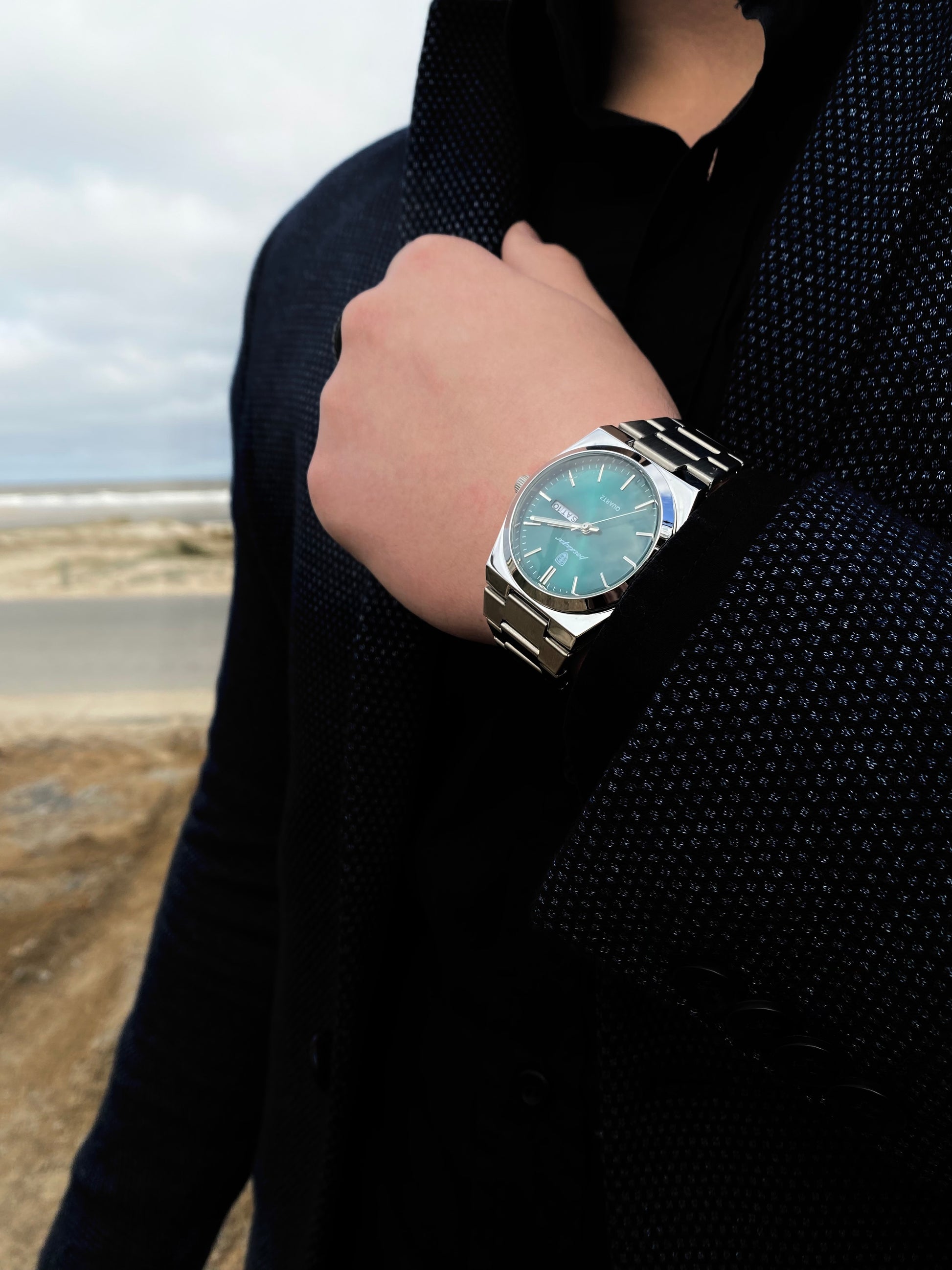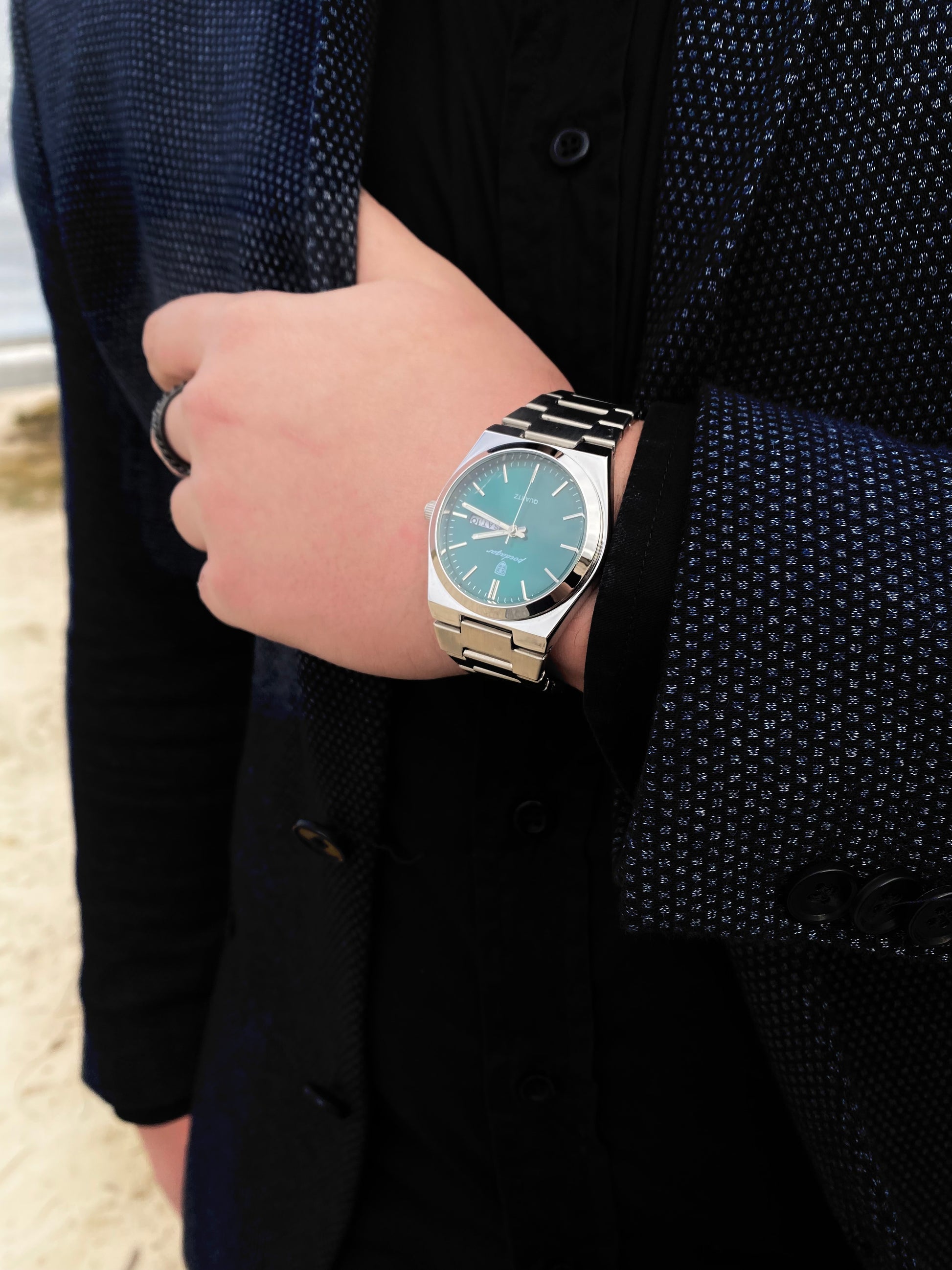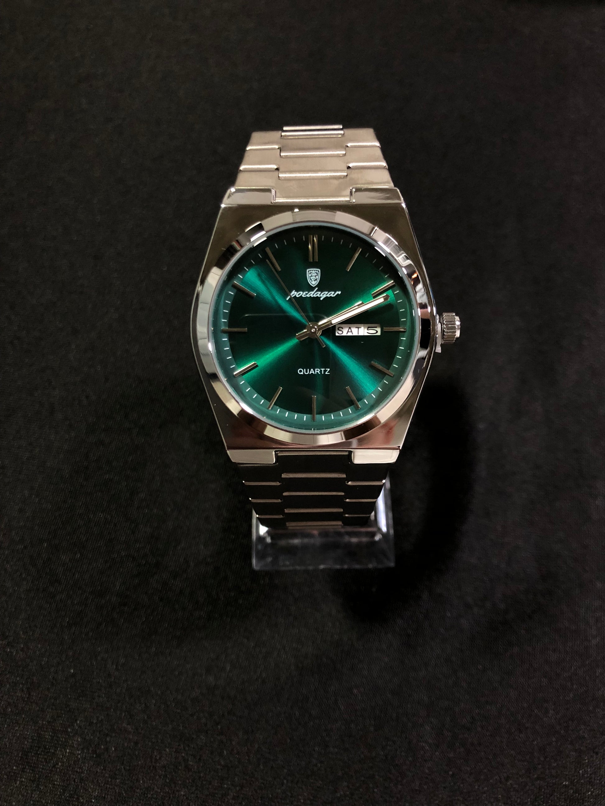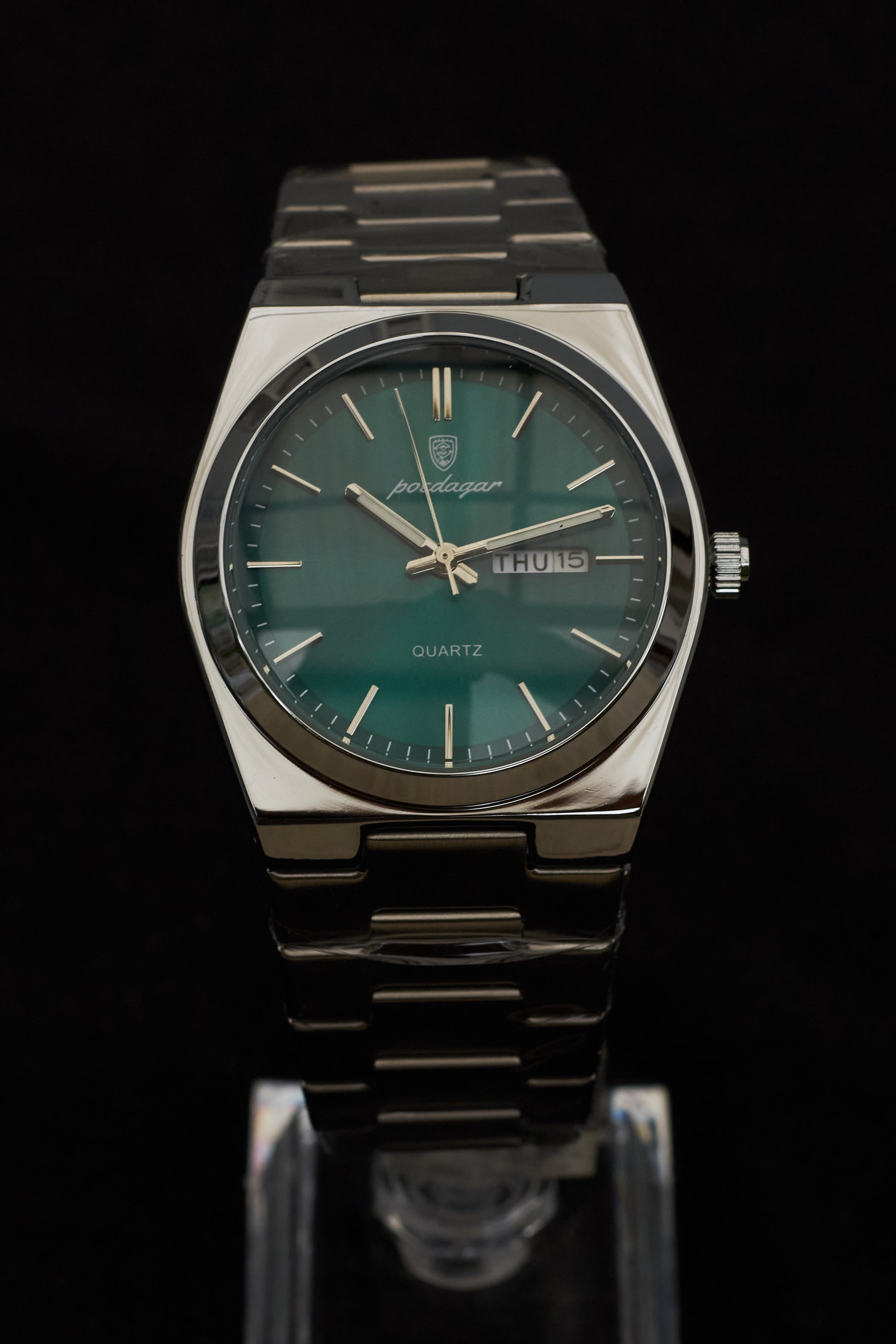 Reloj Poedagar con fondo verde esmeralda y malla metálica plateada